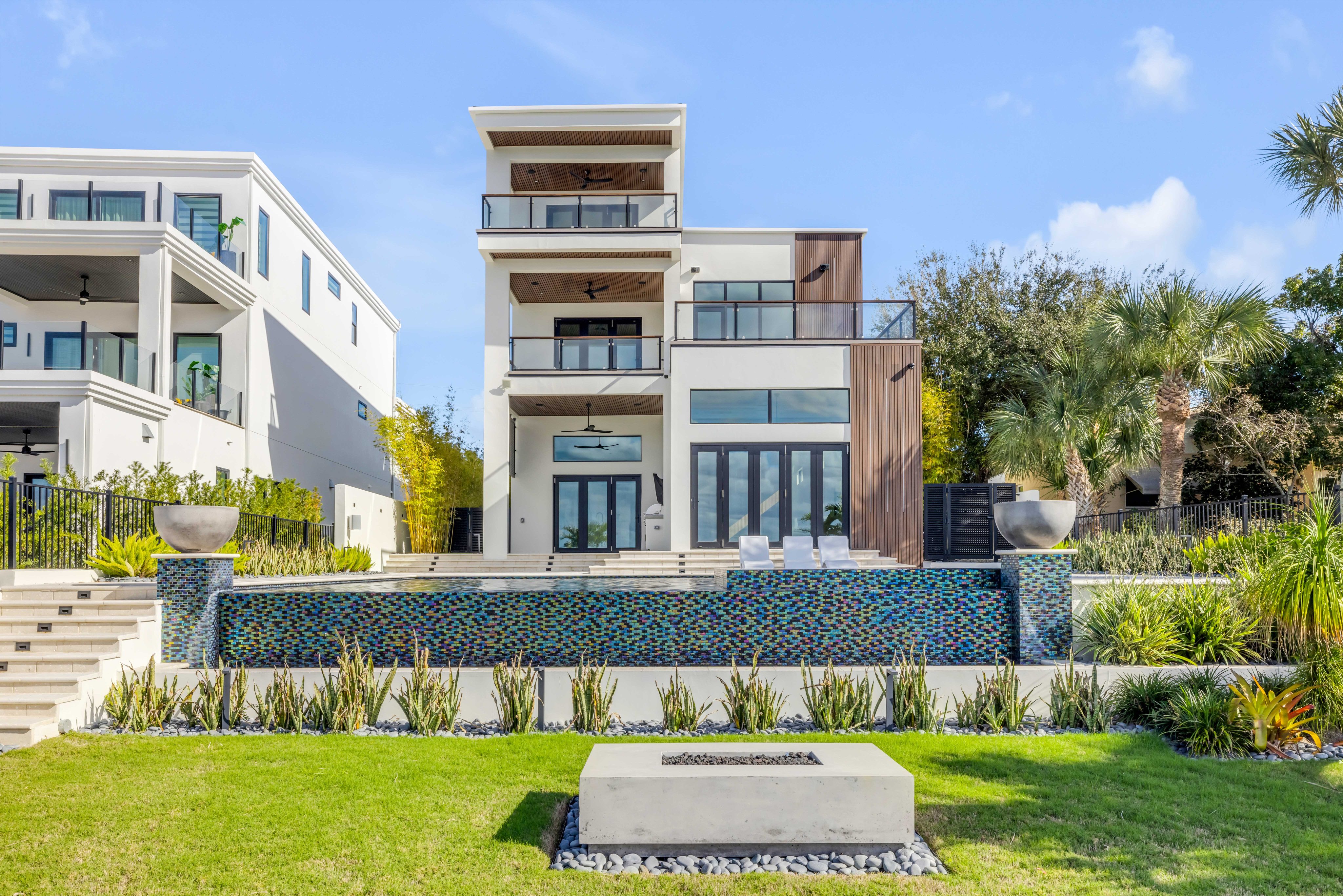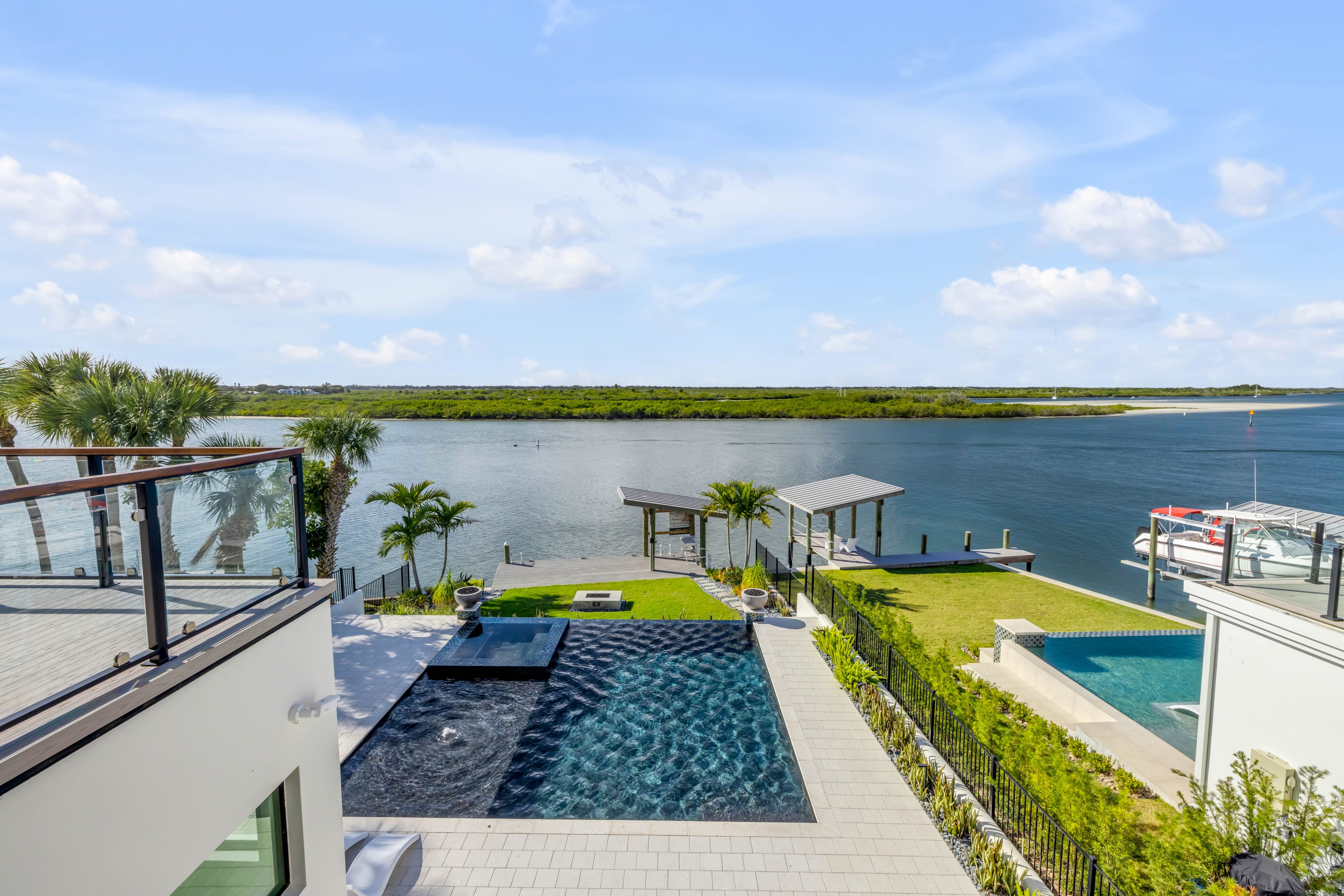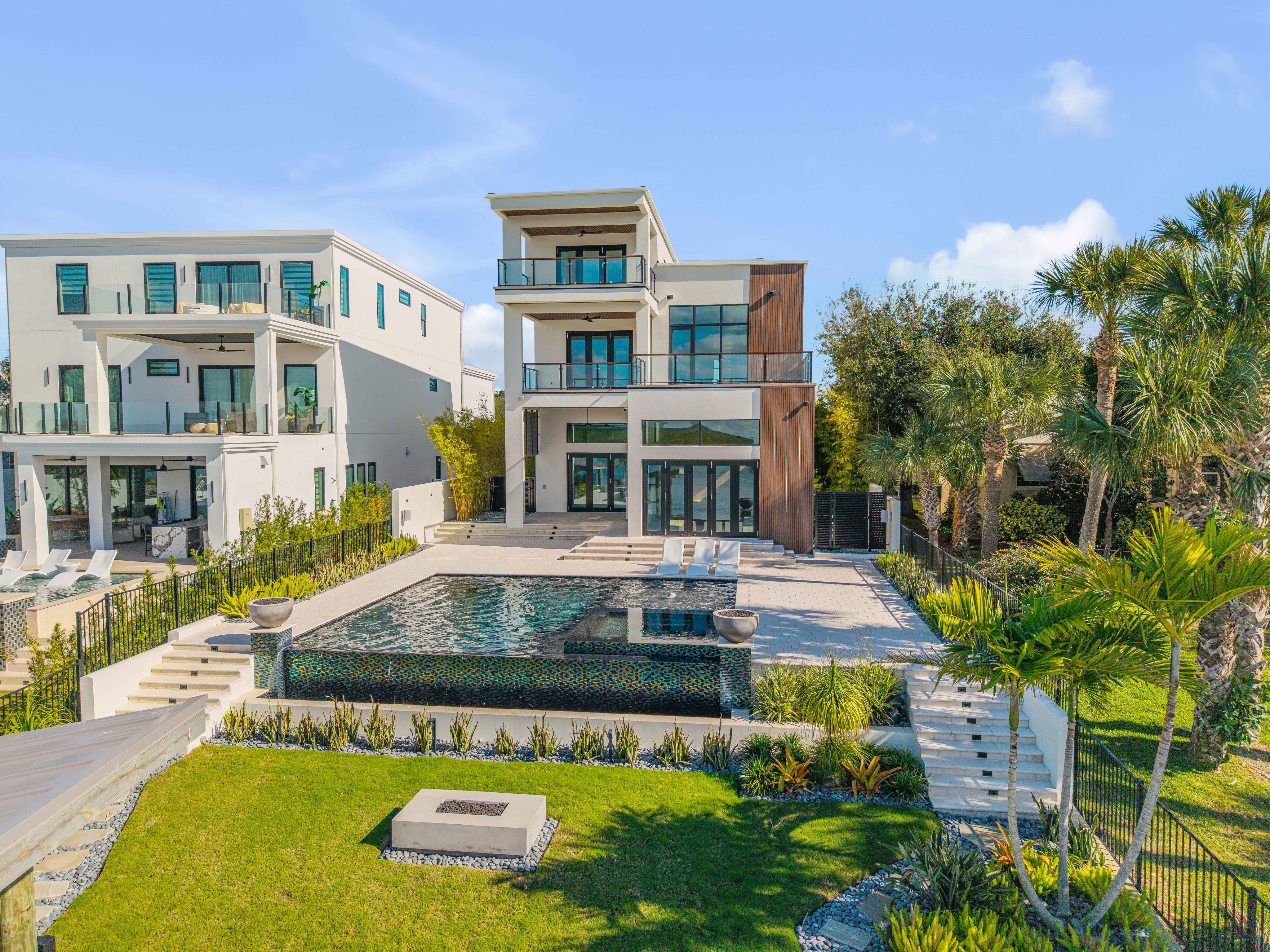 A rare intersection of modern architecture, true deep-water dockage, and a two block walk-to-the-beach living. This never-lived-in year 2024-2025 custom build is on the Intracoastal waterway in one of New Smyrna Beach’s most coveted waterfront corridors. Designed for people who don’t want a “coastal cliché,” this home delivers clean lines, dramatic volume, and walls of glass that pull the water and sky into the living spaces. A private automatic elevator or switch back staircase connects all three levels, creating effortless flow for everyday living and entertaining. The main living level opens to a showpiece outdoor setting: an infinity-edge pool and spa and expansive waterfront terrace built for sunsets, cocktail hours, and quiet mornings that feel like a permanent vacation. For boaters, this is the real deal—deep water access and a private slip accommodating up to a ~50’ yacht positioned for the kind of spontaneous “dock-and-go” lifestyle most waterfront listings only promise. And when you want sand instead of sea, the beach is just a short walk away. Every element is new, crisp, and elevated: high-end finishes, thoughtful lighting, refined materials, and modern systems—all in a home built to feel both striking and comfortable. This isn’t just a home. It’s a waterfront compound for the buyer who values privacy, design, and the freedom to live on the water without sacrificing sophistication. If you’ve been searching for something truly different—a modern waterfront estate that would feel at home in South Florida, offered in a more relaxed, livable coastal setting—this is your moment.